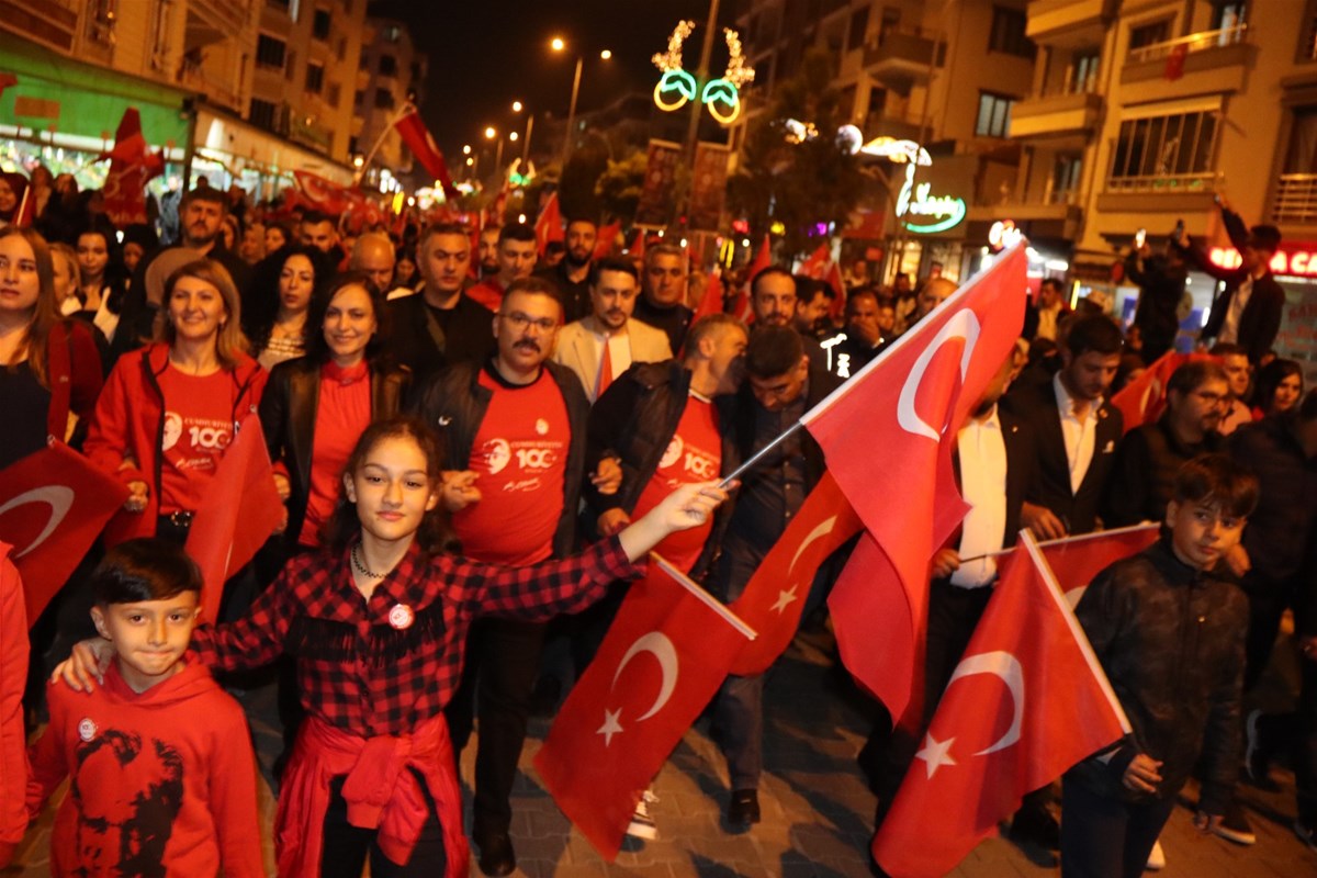 Iğdır'da, binlerce kişi, Cumhuriyet'in 100'üncü yılı kutlamaları kapsamında, ellerinde meşale ve bayraklarla yürüdü.